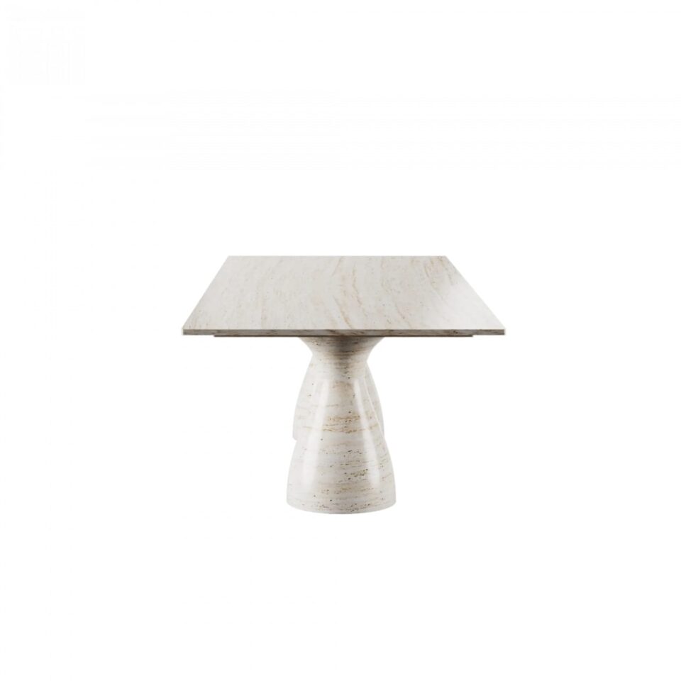 Zimmer Dining Table Travertine is a modern dining table with rectangular top, chunky turned legs, and travertine’s natural color and texture.